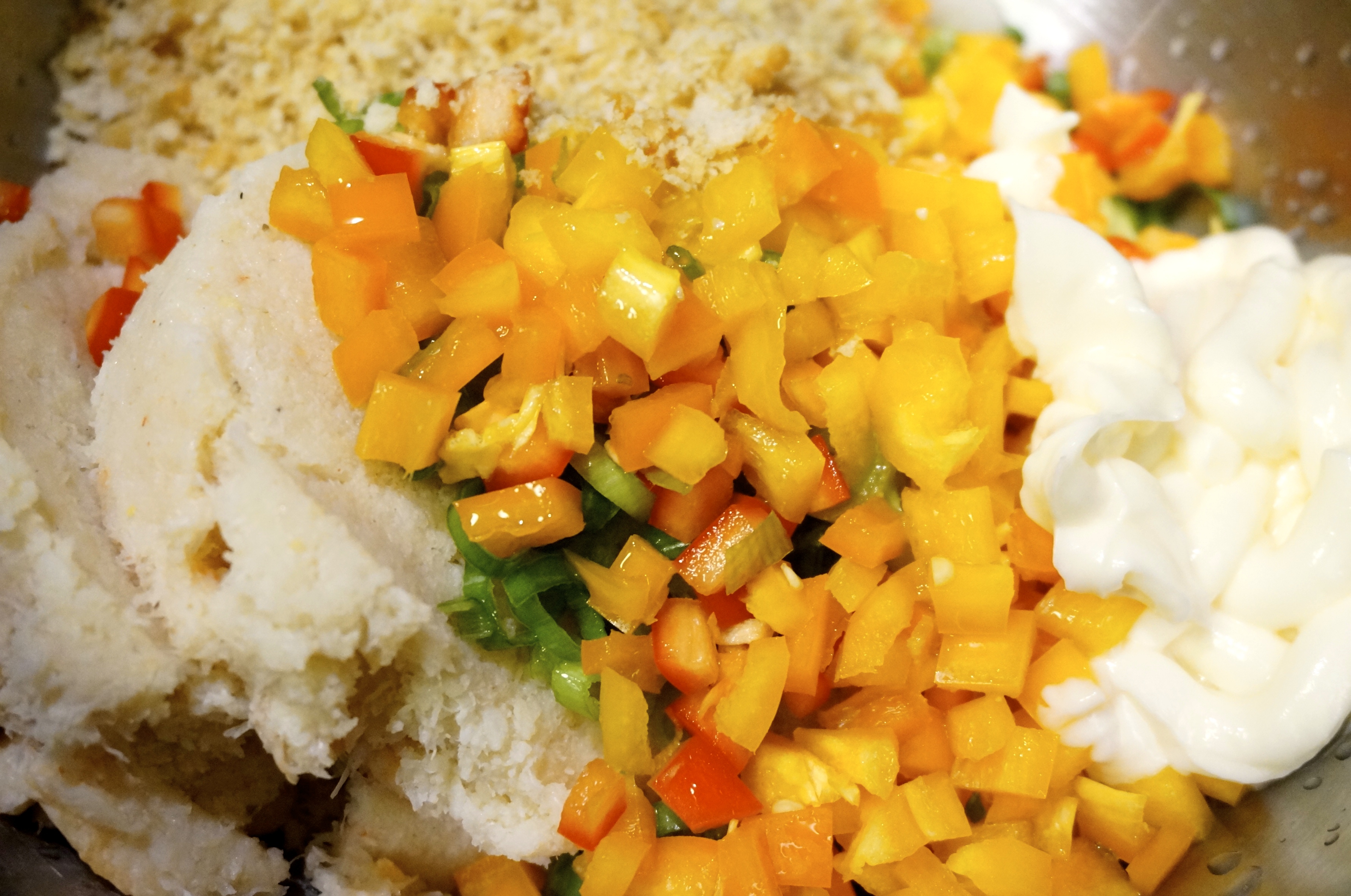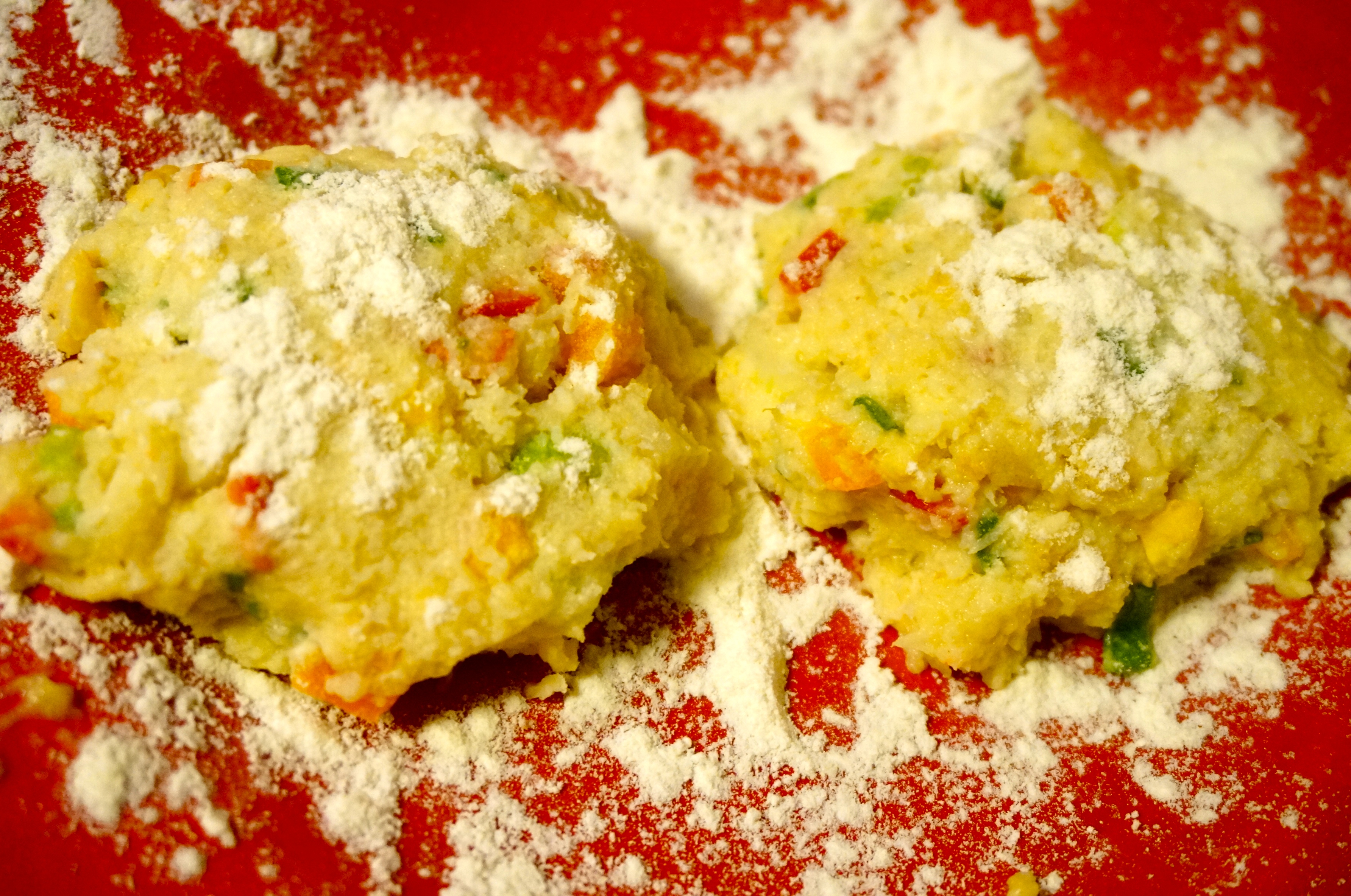 - Pour egg mix into the flour/cornmeal mix and stir until dry streaks are incorporated (easier if you use a rubber spatula), but careful not to overmix