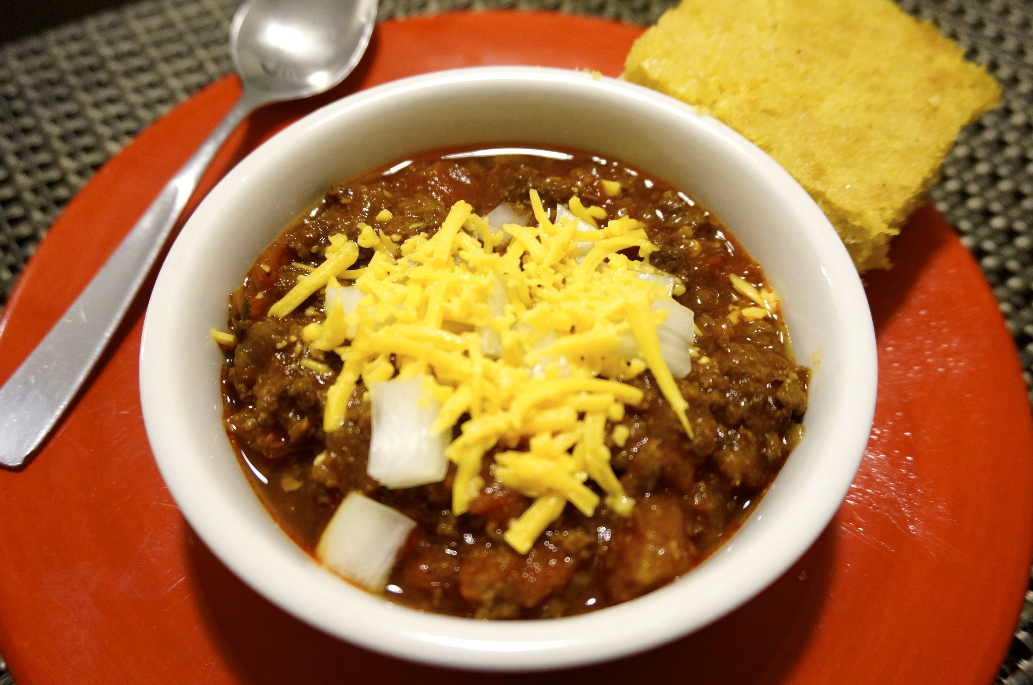 This meal was pretty damn good. It was hearty and nostalgic, but on the downside it lacked any form of real vegetables whatsoever. The chili was pretty oily in the cooker, so before we mixed and served it, I spooned out most of the oil that had risen to the top. I also added a little bit of cornstarch to the chili to thicken it up. The cornbread turned out perfectly, but next time we might add some cheddar cheese to the mix, and maybe some jalapeños too.